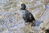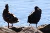 Toute sombre, exepté le bec et le front blancs, ainsi qu'une étroite bande alaire claire que l'on aperçoit au vol; sexes identiques. A terre, dos rond, très grosses pattes.