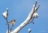 Plumage bariolé; queue noire et blanche; ailes noires, avec unde large bande jaune; masque rouge; reste de la tête blanc et noir; sexes identiques. Les jeunes sont grisâtres, striés de brun foncé, et n'ont pas de rouge ni de noir à la tête.