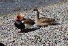 Mâle: grosse tête ronde orange vif; bec rouge; dessus gris-brun; plastron, bande ventrale et arrière-train noirs; flancs blancs; pattes oranges. Femelle: dessus brun, joues et dessous plus clair; calotte, nuque et arrière du cou brun chocolat; bec brun-noir marqué de rose; pattes roses ou jaunâtres. Le mâle et la femelle présentent une large bande blanche le long d'aile, très apparente au vol.