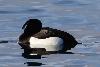 Mâle noir, la tête irisée et portant une huppe tombante, flancs blancs. De juin à août, la femelle et le mâle, en plumage d'éclipse, sont brun sombre uniforme; toujours reconnaissables au vol à leurs barres alaires blanches bien nettes.